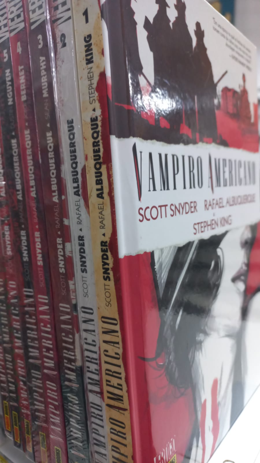 Descrição: HQ Vampiro Americano, 8 volumes edição de luxo. Coleção completa, capa dura em perfeito estado de conservação.Vampiro Americano (no original, American Vampire) é uma série de revistas de histórias em quadrinhos criada pelo escritor norte-americano Scott Snyder. As primeiras cinco edições apresentam duas histórias - uma escrita pelo próprio Snyder e a outra pelo romancista Stephen King, e ambas desenhadas pelo brasileiro Rafael Albuquerque. A partir da sexta edição, Scott Snyder permaneceu como o único escritor. Albuquerque passou a ser creditado como "co-criador" da série a partir da décima-terceira edição. Assunto: HQS (excesso lit)
